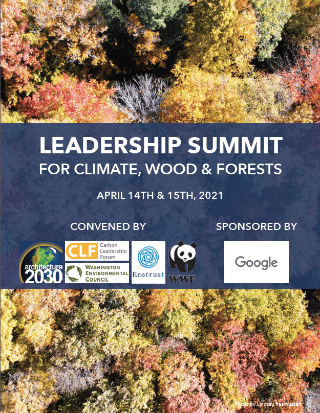 The overarching goal of the Leadership Summit for Climate, Wood & Forests is to harness the power of the green building movement to realize wood’s potential as a climate solution. We will accomplish this by bringing together a select group of thought and practice leaders in green building, embodied carbon, mass timber, forestry, forest science and advocacy in a participative virtual meeting centered on: